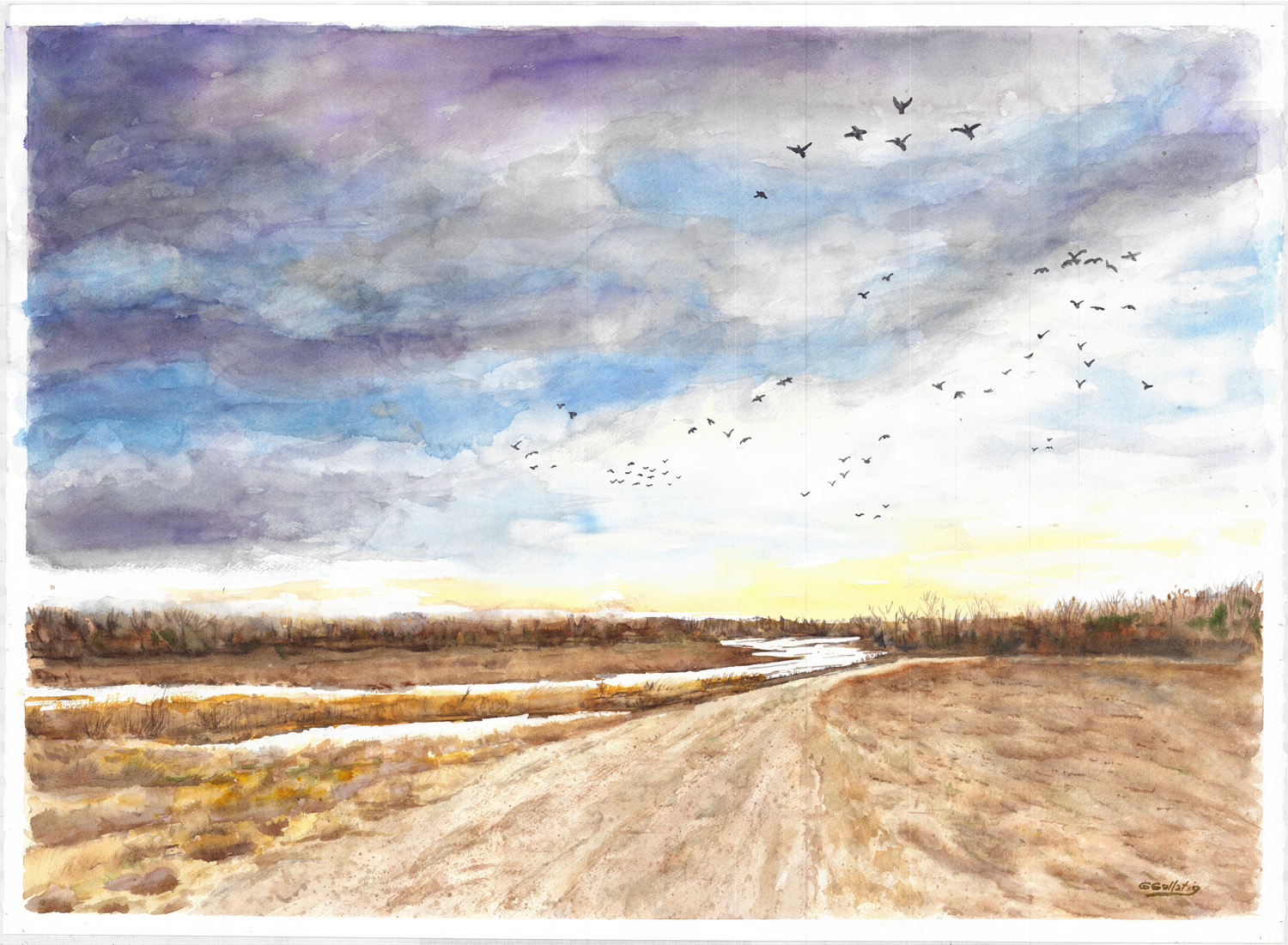 I painted this picture in 2018 in my studio from the photographs. I loved the sky, the birds and the diagonal lines of the river banks pointing to a bend in the river. It was great fun to do a landscape without mixing any greens for a change.