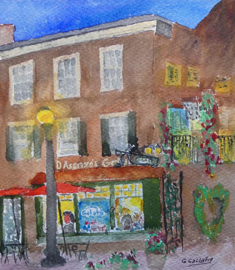 Gelato Stop was painted en plein air on October 17th, the second day of the 2017 Brandywine Valley Plein Air Event. This was my first Nocturne event. This is a view of an ice cream shop on Gay Street in West Chester. I started painting at 6:30 PM and went until about 9:30 PM. It was pretty challenging as lighting changed rapidly as the sun went down and street lights turned on. The air was damp and the paint was slow to dry. Painting outside was much different from painting a night scene from a photograph. The camera seems to pick up a lot more glare than you actually see. Also, your eye sees more color than the camera picks up. It was a bit cool and I struggled at time fumbling in the dark for tools and supplies but had a great time and hope to do more nocturnes.