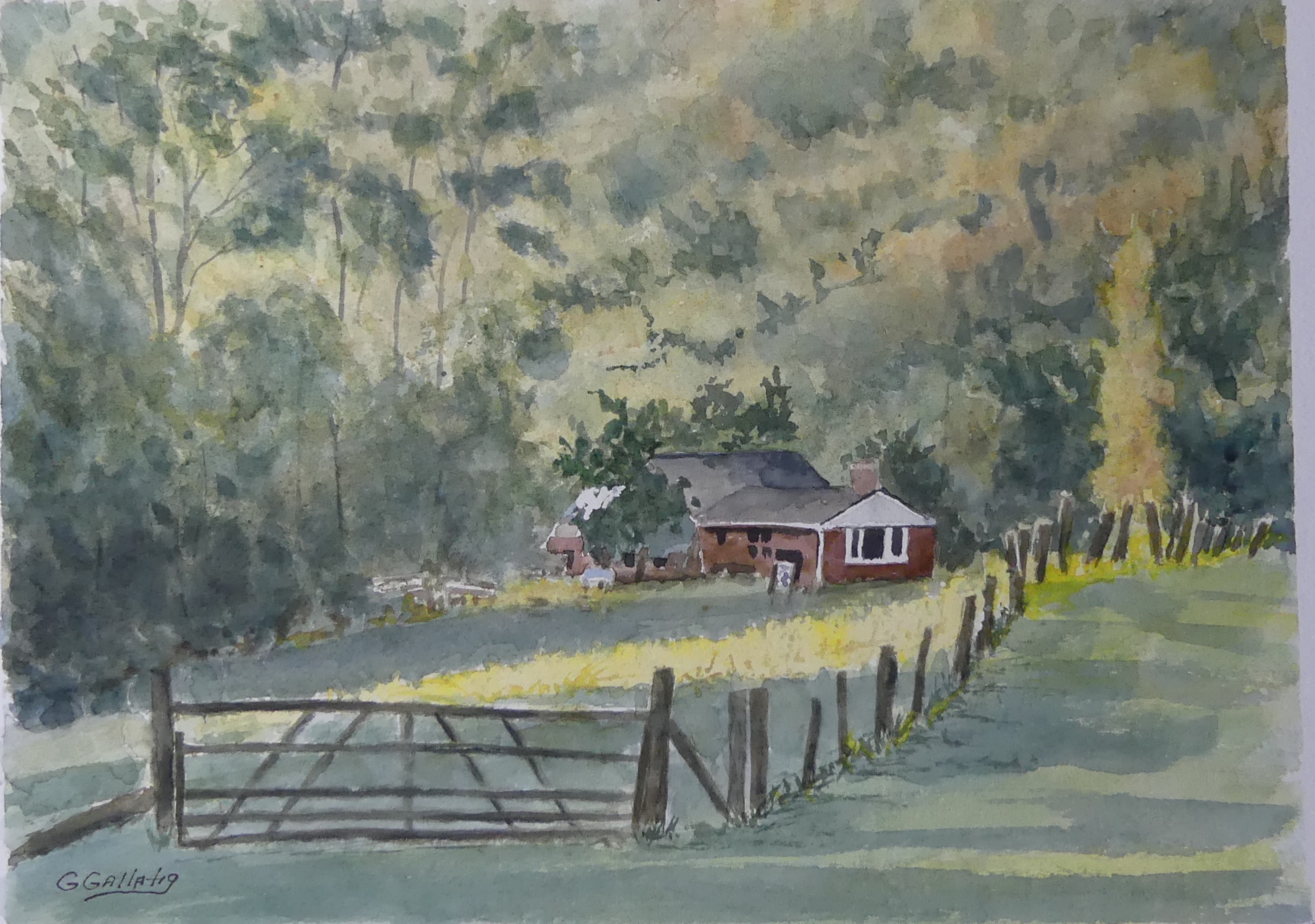 I do a lot of walking in many different places. When pressed for time, I walk the loop in my neighborhood, Brandywine Hills. I typically walk down E. Lafayette Drive particularly in the morning. I love the view as I come down the hill approaching Wayne Drive and look across the pasture of the Double M Ranch see the tress on the hill on the other side of Rte 52 begin to glow as the sun rises. On morning in early October, 2018 as I came down the hill there was a streak of gold bouncing off the the edge of the hill in the pasture where the land slopes down to the house and many of the trees in the distances were edged with gold. There was also a group of cows bedded down in the foreground. It was incredibly inspiring, I took some pictures with my cell phone and went home and started painting.