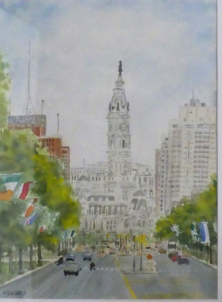 This past summer I went to see the Watercolor Exhibit at the Philadelphia Art Museum. It was a awesome event, I was blown away by 1/2 dozen inspiring artist topped off by Sargent and Winslow Homer whose best works had been saved to the end of the tour. I left the museum and walked down J F K Boulevard on my way to the Dick Blick art store on Chestnut Street. The scene from the top of the steps was inspiring. I had my camera with me so I snapped a few photos. “Leaving the Art Museum” was painted from these photos in my studio in September of 2017. I like the way the shape of the trees and the flags drew the viewer in to city hall. I also like the way William Penn stood at the top. I chose not the paint the scaffolding that surrounded the building. I found this painting difficult but enjoyed the process and hope I did it justice.