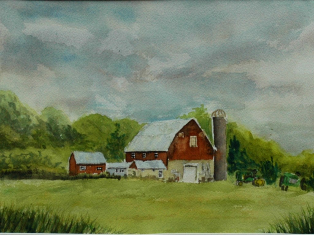 In July of 2016 I went with my son Steve to the 13th Annual Busy Bird Bluegrass Festival. The event was held in Berkshire New York. Steve’s band, the Jersey Cornpickers, were playing at the festival. I went along to see the festival and to man merchandise sales while the band was playing. It was also an opportunity to do some jamming with my banjo. We were camping and I took my watercolor supplies along but didn’t get a chance to paint up there. This farm was across the road from the fields where we camped and was the view from the back of the bandstand where the bands played. It looked really cool with a row of tractors sitting outside so I took some photographs and painted it in the studio when I got home.