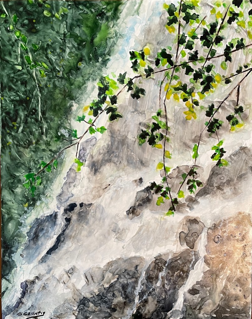 Falling Water was painted in early February of 2023. It is a watercolor painted on Yupo. This is a polymer material that is smooth and impervious to water. It is quite different from painting on watercolor paper. The paint sits on the surface and moves around until it dries. I wanted to get familiar with using it prior to attending a DVAL workshop by Judith Hummer on painting on Yupo scheduled for February 21st, 2023