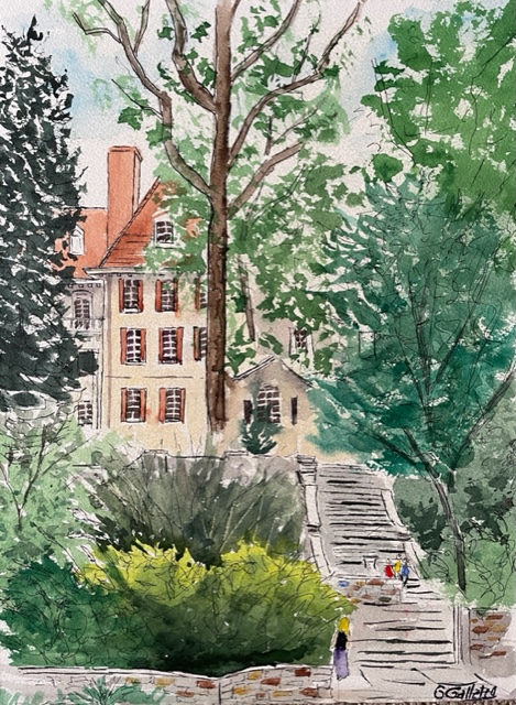 “The Back Of The Mansion” was painted at Winterthur on September of 2021 during a wine tasting event. I loved the view looking back at the mansion from the Icedale Terrace. I was struck by the way the stairs led you into the scene with the mansion nestled back among the trees.